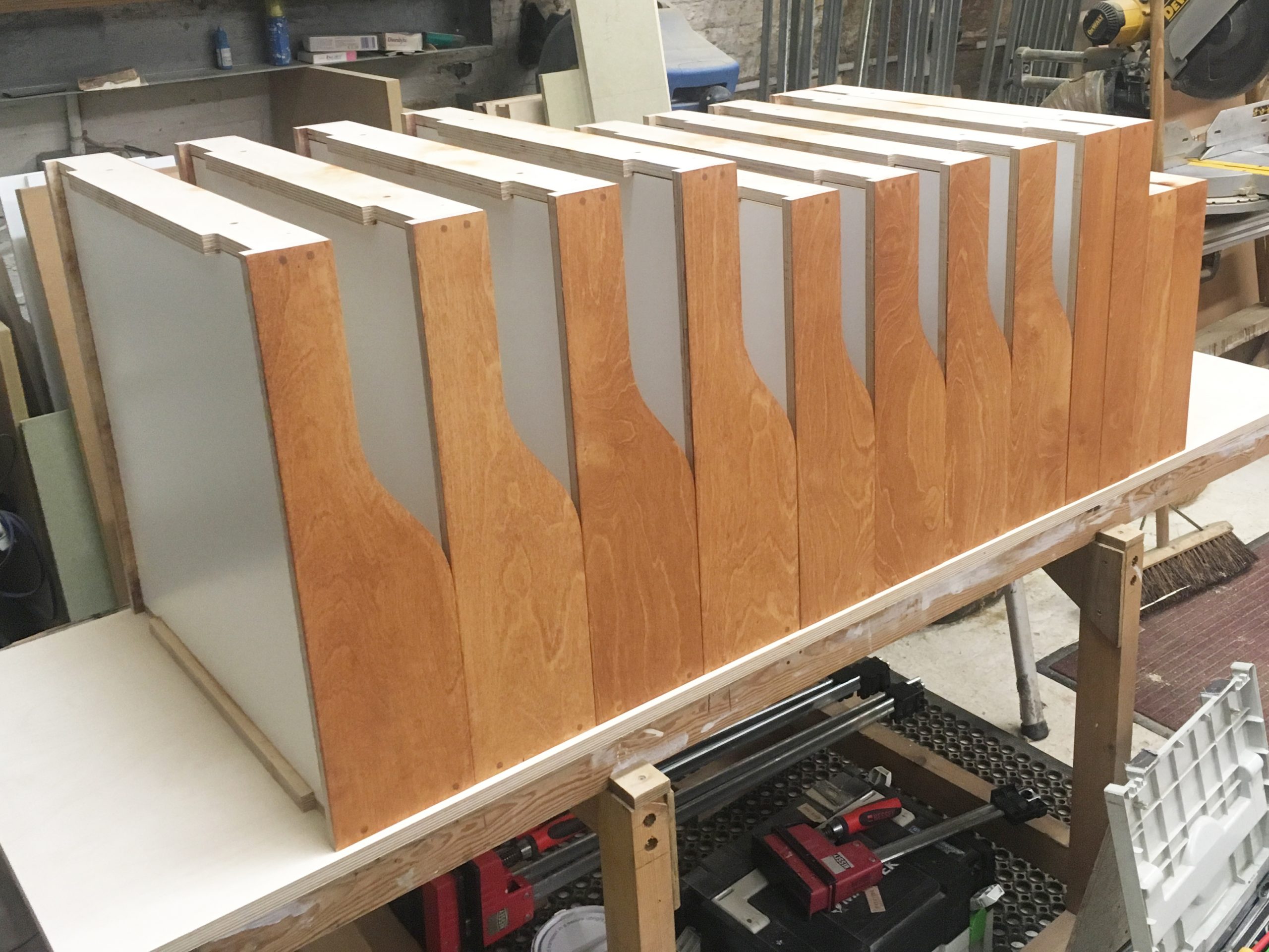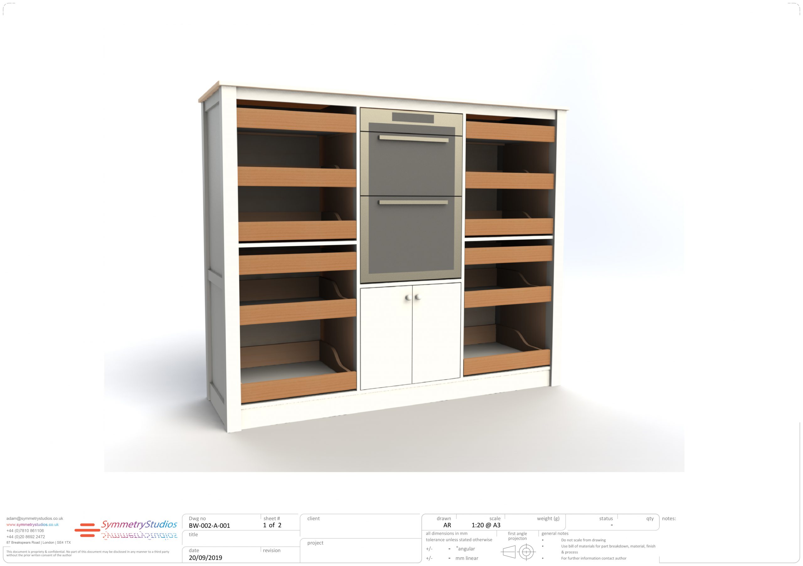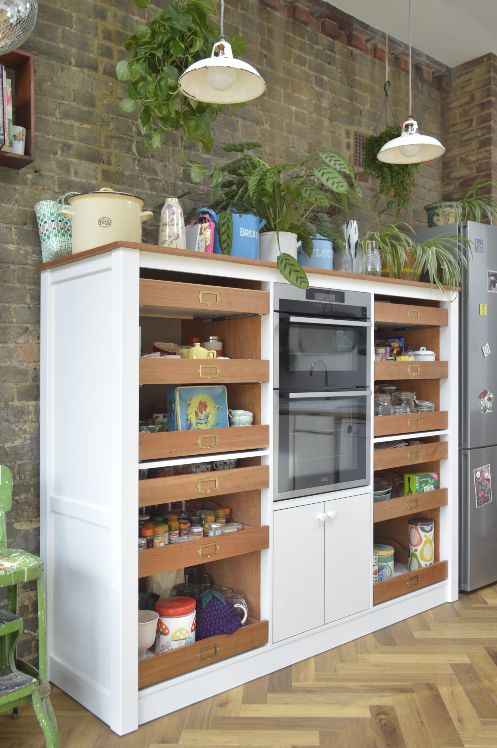 Part of the Glynd House project the 'Cook's storage' unit was built to to specific wishes of the client to replicate an item of furniture that features in Jamie Oliver's television cookery show. Adaptations were made to accommodate the oven supplied by the client as well as other subtle changes to tie in with material choices used in the other elements of the main kitchen. The solid cherry drawer fronts and brass card holders contribute to the vintage aesthetic.